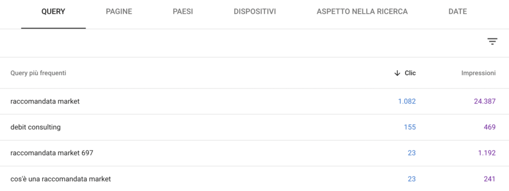 La keyword principale “raccomandata market” è riuscita a generare più di 10.000 impression e 696 clic da subito, con un tasso di conversione del 6,9% e posizionandosi tra il 4 e il 5 posto nella classifica dei risultati di Google! Le query sono le parole, attraverso le quali, un utente effettua una ricerca online.