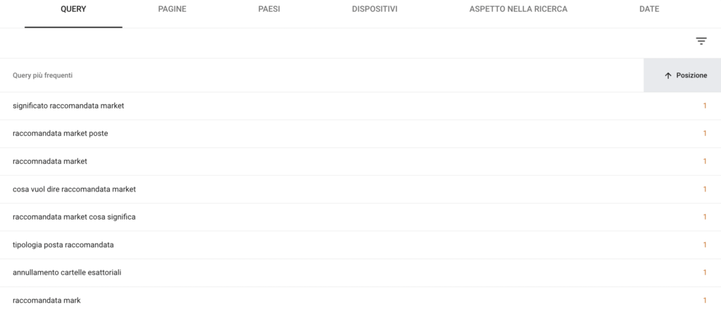 - Posizione: è il ranking relativo al posizionamento di un link su Google. 1 è la posizione più alta in classifica, la 2 la successiva e così via.